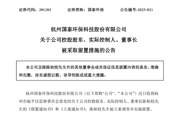 The reporter of the Zhao News Poster in Wu Junlin, on August 17, Hangzhou Guotai Protection Technology Co., Ltd. (301203) announced that the company recently took over the “Retention Notices” and the “Retention Notices” issued by the Supervision Committee of the Linping District of Hangzhou, as the company that controls the company, the company Chen Contue and President Chen and the President.调查并拘留了Chen Baixiao。资料来源:深圳国泰国王保护股票交易所宣布,该公司具有完整的政府结构和内部控制机制,称其将根据“中华人民共和国人民共和国”,“深圳证券交易所的增长市场”,“公司和法规的运营和法规规定的行动和法规”的规定和规定的规定和法规的规定和规定的规定,并遵守规定的规定,并遵守规定的规定。适合T他的相关工作和Arew认为Chen Baijai出生于1968年,您拥有中国国籍,并且在国外没有永久的居民。 sets.n hangzhou Taipu环境技术有限公司和Hangzhou Guopu Environmental Technology Co.,Ltd。投资并连续建立,涉及中间体和有机化学品的生产。自2024年8月以来,根据Zjiang科技大学学生协会的信息,您于2023年10月在Zhijiang大学捐赠了500万,以建立“ CATHA环境发展发展发展基金”。 Chen Baijai说,今年(2023年)是他母校成立70周年,这对技术大学来说是一个很棒的事件,也是一个很好的活动。在母校发展的关键时刻,对母校高质量的发展做出合法贡献是一种渴望和荣幸成为一所大学工作的学生。国土环境保护成立于2001年,位于Z江省。这是一种污泥处理,并使用资源,环境生态恢复和资源回收。使用环境的高科技公司。 2024年,国泰航空环境的保护获得了3.36亿元的运营收益,比上一年增加了1.98%。净收入是由于母公司所有者的股票而获得的,年龄降低了4.80%。截至2024年12月31日,该公司的总资产为15.22亿元人民币,同期增长了1.00%。在2025年第一季度,仍然存在一种现象,即“收入的增加不是利润的增加”。该公司的收入为872.246亿元,比上一年增加了6.11%。同时,归因于贸易公司股东的净收入下降了19.66% – 年龄o 2659.28亿元。 [如果您有任何新闻曲目,请提供LTO信息。电子邮件地址信息:zhongbobaooliao@163.com]