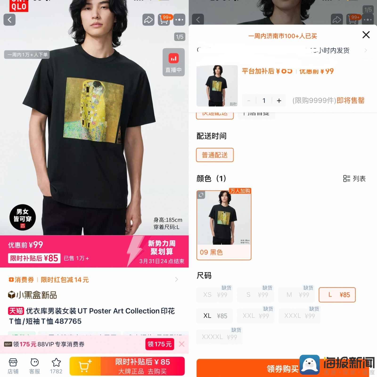 海报新闻记者秦文济南报道3月25日,周杰伦时隔4年正式发行首张新专辑《太阳的孩子》,全网爆红。专辑首支19秒预告片向克里姆特名画《吻》艺术形象致敬,优衣库 x MoMA 联名T恤意外走红,掀起音乐与时尚界的跨界热潮。 3月25日,海报新闻记者在优衣库淘宝天猫官方旗舰店看到,印有克里姆特《吻》的T恤各种尺码均已售空。这款印有克里姆特《吻》的优衣库 UT 已经冷门很久了。得物APP数据显示,刚推出时,T恤的月销量只有两件,几乎没有人关注。 《太阳之子》预告片发布后,粉丝们很快看到了优衣库的同款T恤,引发抢购购买它们。预告片发布三天后,T恤销量迅速破百。3月25日,海报新闻记者在淘宝天猫优衣库官方旗舰店看到一件T恤,原价99元,折后价85元。过去 7 天内,已有超过 60,000 人看过,超过 10,000 人提出请求。目前仅提供 L 和 XL 尺码,S 及以上尺码已售罄。这款衬衫也迅速登顶天猫印花文化衬衫畅销榜,连续五天稳居榜首。根据挂牌信息,24小时内售出超过500套。粉丝的火爆直接拉动了二级市场的交易价格。这款联名T恤原价99元,但在得屋等平台最高成交价为239元,溢价140元,涨幅1.4倍。一夜之间,原本普通的艺术T恤变成了标签被冠以“周季伦新专辑周边”的称号,成为粉丝中的“应援T恤”,也有网友调侃为“杭州演唱会限定T恤”。这款T恤是优衣库与纽约现代艺术博物馆(MoMA)的定期合作款。与周杰伦并无正式合作。这种人气的爆发完全是巧合。网友调侃:“优衣库大神预言了周杰伦的新专辑。”通过“预先策划”的联名艺术单品,无需任何营销投入,精准打造顶级人气,销量与口碑双丰收。