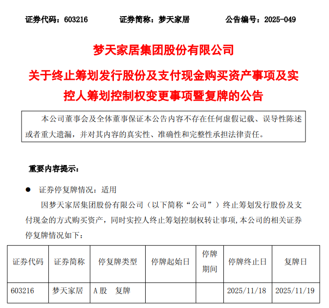 海报新闻记者周凌峰报道,11月18日晚,梦天家居(603216)的一系列公告打破了资本市场的平静。这家以定制家居为核心业务的上市公司宣布,已取消收购上海四川图威电子有限公司(“四川图威电子”)控制权的重大资产重组计划,以及拟变更现任控制人控制权的计划。公告显示,公司股票将于11月19日开盘日正式复牌,但在终止公告的同时,还有消息称实际控制人计划减持部分股份。停顿10多天的资本运作最终以“双终止”得到解决。据报道,这种跨界“芯创”尝试并非突发奇想,而是蒙田家居的一次变革性设计已经发展多年。时间线可以追溯到11月5日。蒙田家族突然宣布暂停业务,并透露计划通过发行股票、支付现金、筹集扶持资金等方式取得川图微电子的控制权。这一消息的发布,表明了市场进军高端芯片领域的决心。据公开资料显示,四川土微电子历史悠久。自2016年成立以来,我们专注于高端模拟芯片的研发和销售。虽然没有透露具体的经营业绩,但根据四川微电子官网公布的信息,该公司实现产值和利润增长符合趋势,其中值得注意的是,四川图微电子多次报道了独立上市的消息。今年6月,四川图威电子召开股市重组成立大会rm,这被解读为“迈向首次公开募股的重要一步”。 2025年7月,公司由另一家有限责任公司变更为股份有限公司,股权分置改革正式完成。从今天来看,梦天家居收购计划的完成,让川图微电子具备了回归独立上市的能力。记者发现,收购四川图微电子是梦天家居在芯片领域的“过激举动”。公司已于2020年3月投资7000万元入股重庆凌芯微​​电子有限公司,收购35%的股份,成为第二大股东。当时,该公司公告已完成相关工商变更登记。从参股试水到核心公司规划与管理,蒙田家居的“造芯”之路已然走得更远事情逐渐明朗,但进展速度却远远超出市场预期,其结局却出人意料。至于终止的原因,该公司仅限于笼统地表述为“交易各方未能就基本条款达成一致”,而没有提供更多细节。在公告重组完成的同时,同日还发布了股东权益变动公告。蒙天家居大股东蒙天控股及其子公司拟向嘉兴汇鑫转让15,284,500股无限售条件股份,占公司总股本的6.86%。本次转让价格约为17.4592元/股,高于公司停牌前收盘价15.70元/股。本次转让后,实际控制人余景源先生、范晓珍先生通过关联方仍持有 67.68%的股份。各方,其控制权没有改变。不过,这种参与度的减少仍然被解读为控制者本人“适度退出”的标志。记者深入调查后发现,无论是跨界变革的热情,还是实际控制人的保留力减持动作,都与持续承压的蒙田家具业绩密不可分。财务数据显示,公司自2021年上市以来业绩持续下滑,2022年至2024年营业利润将从13.89亿元下滑至11.17亿元,归属母公司净利润从2.2亿元下滑至6100万元,盈利能力逐年下滑。 2025 年第三季度报告的数据揭示了更多的运营挑战。报告期内,公司实现营收7.73亿元,同比下降2.93%。净利润af扣除非归属利润3687.1万元,与上年同期3687.74万元基本持平,微降0.02%。 11月19日开盘后,梦田家具报17.27元/股。该股开盘上涨10.00%并触及涨停。
