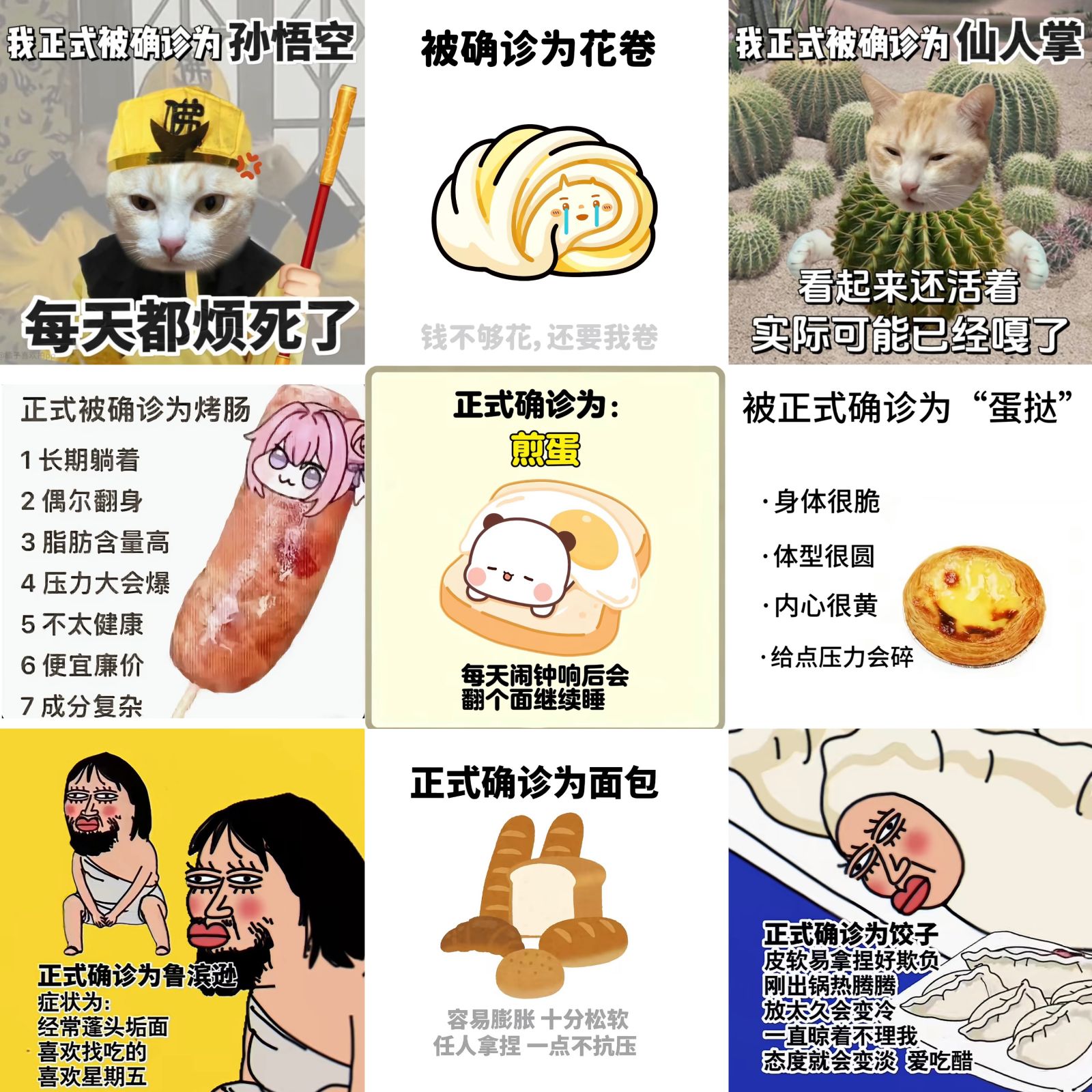 《海报新闻》编辑于琳琳 当我打开社交软件时,仿佛一不小心就进入了一个大型的“网络诊所”。有人拍着肚子宣布自己“正式确诊为蛋挞”,有人一屁股坐在沙发上声称自己是“烤香肠”,还有人用情绪化的语气直言自己“确诊为安玲珑”。没有挂号费,也没有测试,只有一个“诊断”就能解除您的疲劳。现代人心中隐藏的美丽。这个“正式确诊XX”的表情包,也算是网络表情包中的“常青树”了。早期曾有“西安人诊为沉梅庄”、“广东人诊为依萍”等著名场面。如今,蛋挞、烤香肠等现实新“病”开始流行,在网络上引发笑声和反响。今天,我们就来盘点一下不断出现的有趣“诊断对象”,分析一下每个“疾病”背后的真实个性,并谈谈为什么我们总是喜欢这样“对待自己”。网络上每一个著名的“诊断”场景都让你我感动。现代网民的想象力在“诊断”方面被发挥到了极致。一切都可以“诊断”,从影视人物到糖果和各种产品,每一种“疾病”都准确地反映了现代人的生活状况。食物“诊断”:脚踏实地过幸福生活。 “诊断”的主要类别肯定是食物。毕竟,谁能拒绝形容自己很美味呢?每种美味对应的状态就像是在说“我”。 ✅ 正式诊断为蛋挞:外皮酥脆现代的独家标签。官方的“诊断标准”精确得令人痛苦。身体很脆弱,身体很圆,心脏很黄。只要稍微用力一点,我就感觉身体就会断裂。当你的老板上班时骂你或者错过地铁,这款“蛋挞”就是完美的“脆脆玩家”,瞬间打破你的防线。 ✅ 官方诊断为烤香肠:长时间躺着,偶尔翻身,脂肪含量高,压力爆炸,成分复杂,经济实惠,非常适合现代家庭聚会和日常工作生活。 ✅ 正式定名为汉堡:溢出的“汉”的完美诠释,只为温暖世界“汉堡”的现实!外表是坚硬耐用的质量,就像工人的“盔甲”。软软的肉汉堡+里面的酱汁,就是我们用高强度守护的“包子”。这很有趣,它让你哭泣,它很友善,而且很真实。 ✅ 正式诊断为潘:容易膨胀,稍微受点赞就飘在天上,全身软软的,气质好,可以被别人操纵,重要的是不抗压一点压力都会“崩溃”,就像现代青年一样,没有气质,很容易妥协,有时会自我膨胀,但也经不起一点风雨。 ✅我已被正式诊断出患有玉米饼。每天闹钟一响,我就翻身继续睡觉。以“闹钟是别人的,睡眠是我的”为主题,我不内向,不焦虑,轻松,平静,时不时地允许自己偷懒,这是一种善意,让我能够与自己和解。 “诊断”一个角色/电影或电视节目:用一个角色来表达你对自己的真实感受。与食物相比,电影或电视节目中角色的“诊断”更具相关性。毕竟,谁没有在某个角色身上看到过自己的影子呢? ✅ 正式诊断安琳龙:内耗人士+敏感明星。主题是“敏感、不信任、急躁”脑子里总是想着别人不经意的话语,他总觉得自己“不够好”,他尽力去适应,但和我们一样,在人际关系上小心翼翼,总是陷入情绪之中,很容易产生内耗。 ✅官方诊断为鲁滨逊漂流记:社交孤僻的运动员。他很懒,他喜欢寻找食物,他喜欢周五。他每天的乐趣就是“照顾自己”,专注于“将自己与世界隔离”,将“社交恐惧”铭刻在他的DNA中,并在自己的小世界中自给自足。 ✅孙悟空官方诊断:我每天都感到沮丧。 KPI打造的“黄金棒”承载着他身上数千公里的压力。当我把他捧在手上,抬头一看,一切都是“九九九八十难”,主旋律是“力气很大,心力交瘁”。虽然他有能力反抗,但他永远不会成为一个能够逃离眼前的“混乱” ✅官方诊断是Na In:满嘴脏话但心地善良+快球手。当我生气的时候,我想大喊:“那是胡说八道,简直是危言耸听。”我讨厌虚伪,更喜欢诚实。虽然你有时会很冲动,但你仍然过着真实而自由的生活。他们扩展了想象力。除了美食和人物,网友们的想象力也蔓延到了各种奇怪的物体上,每一个都让人忍俊不禁,却又莫名贴切。 ✅煤气罐官方诊断:具有易燃易爆气质。他们一般看上去沉默寡言,无害,但一旦被激怒,他们就像一个瞬间爆炸的煤气罐。主旋律是“我受不了了,我不必再受了”,真实地描述了现代人的情感爆发。 ✅仙人掌官方诊断:看似还活着,其实已经死了。准确地表达了“社会都是对外界刺激的防御。虽然看似生机盎然,实则根部干燥,但却坚挺不倒。 ✅官方诊断为美杜莎:情感脆弱之星。含水量100%。社交时假装成大人。遇到小挫折就开始哭泣、泄气。虽然看起来柔软,其实很脆弱,稍稍就会流泪。 “确诊”已经流行了很多年,但为什么我们这么沉迷呢?其实,“正式诊断出XX”的梗在网络上如此流行,主要原因在于它准确地击中了现代人的情感痛点,让他们以最简单的方式解决了最真实的情感需求。 原因一:幽默和自嘲开辟了释放压力的新途径。前现代青年 它隐藏在工作中的 KPI 中k、对社交和生活琐事的疲惫。他们不想公开表达自己的痛苦和疲劳,也不想把自己的感受隐藏在内心,所以“被诊断的身体”简直就是完美的出口。它不像“疯狂文学”那么激烈,也不像“无稽之谈文学”那么荒诞。相反,他们用轻松、自嘲的方式将“我累了”、“虚弱”或“我不想去约会”等不言而喻的感受转化为幽默的“诊断性陈述”。当我说“我被诊断出患有蛋挞”时,我并不认为自己很弱,但我把它当作一个笑话。做到这一点的方法是认识到自己的“皮肤干燥”并缓解压力。被“诊断出香肠”并不意味着你感觉平庸,而是你平静